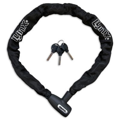 Das schwarze, 120 cm lange LYNX-Kettenschloss ist hervorragend für Fahrräder, Mopeds und Motorroller geeignet. Das Schloss wird mit einer Informationskarte, einer Nylonhülle zum Schutz des Fahrrads, Mopeds oder Rollers vor Beschädigungen und 2 Schlüsseln geliefert. Das Schloss ist aus gehärtetem Stahl hergestellt und außerdem wetterfest.